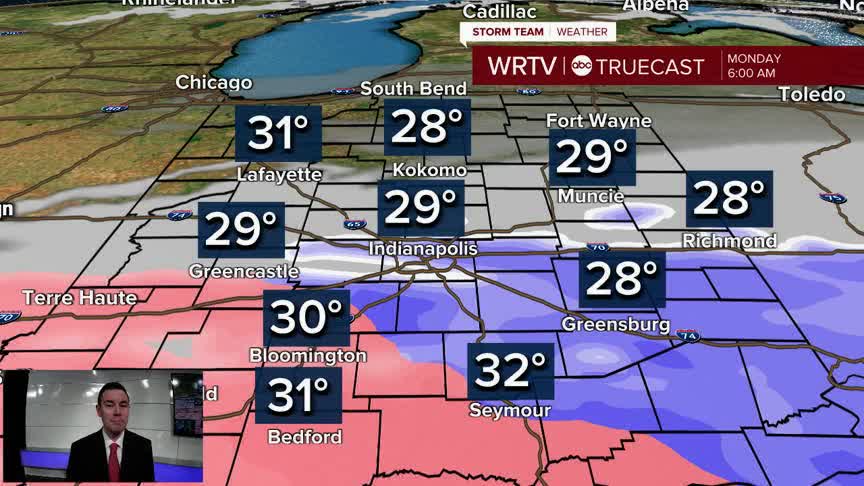 The main area of concern is along and south of I-70. That's where a Winter Weather Advisory is in effect until 9AM Monday. A band of about 1"-2" of snow is possible near I-70. There will be a sharp drop in snowfall north of this band. Across southern areas, snow may transition to sleet or freezing rain. This would limit snow potential, but could result in a light glaze of ice. A small shift in the track can have a big impact on totals. Be prepared for a slow commute Monday morning.