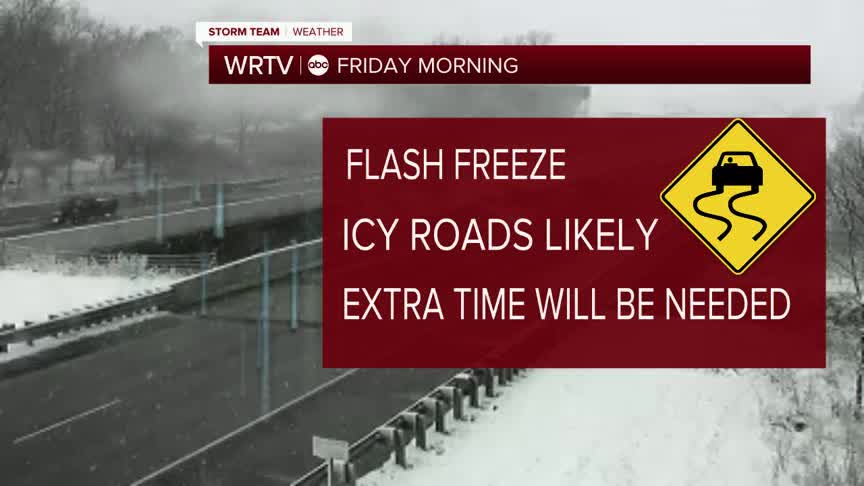 Temperatures will drop very quickly overnight, falling from the 50s into the teens and resulting in a flash freeze. This is not the same as a freezing rain event, but any moisture on the ground will freeze over. Treated roads should be okay, but you will need to be alert for the potential of slick spots.
