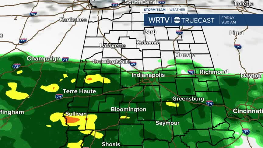 Rain continues to push across Central Indiana through the day Friday. Rain will be falling steadily, so have an umbrella ready to go. Temperatures are a bit warmer to end the week, with highs in the mid to upper 50s.