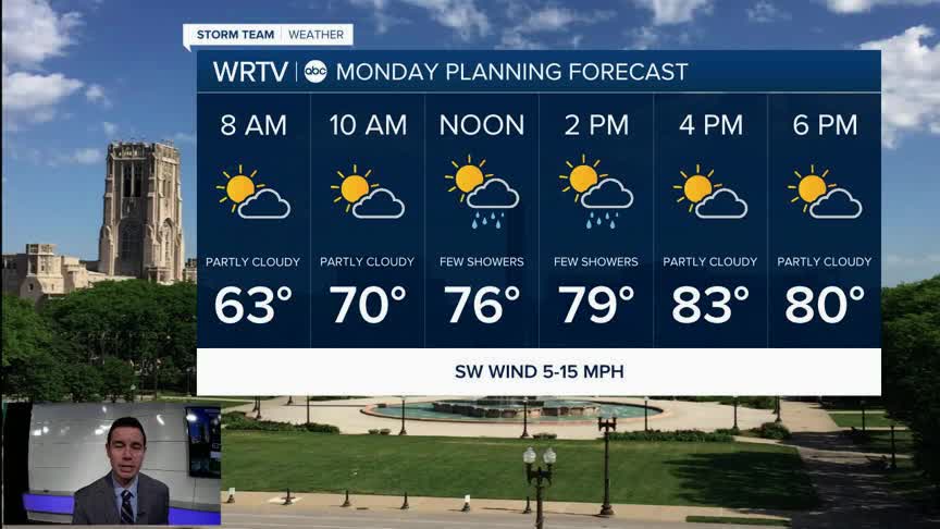 Monday is likely to be our last day to bring the summer warmth for a while. Afternoon temperatures still warm into the lower 80s with a few more clouds working in as well. We will notice a little more humidity as a SW wind brings in a little more moisture for our next weather system to work with.