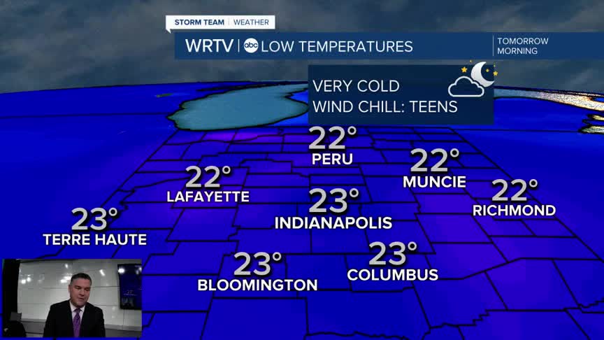 Overnight: Very cold. Mainly clear. Low: 23° (Wind chill: Teens)