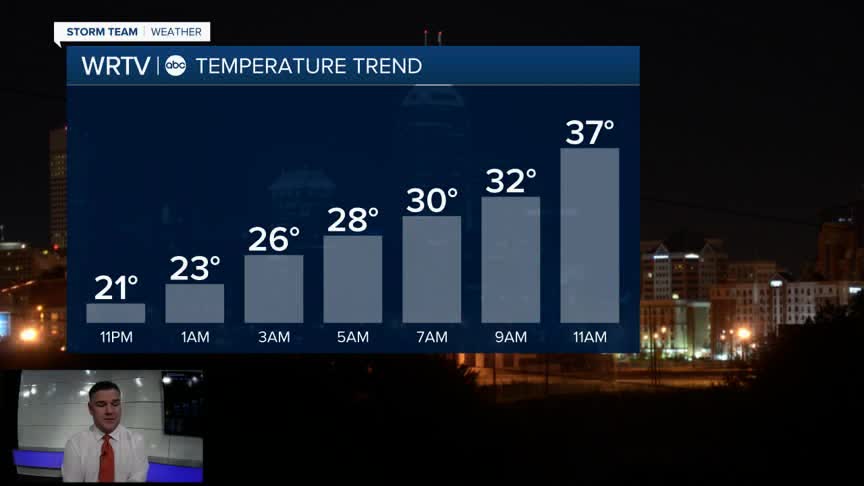 Overnight: Mostly cloudy. Snow showers north. Low: 23° (slowly climbing)