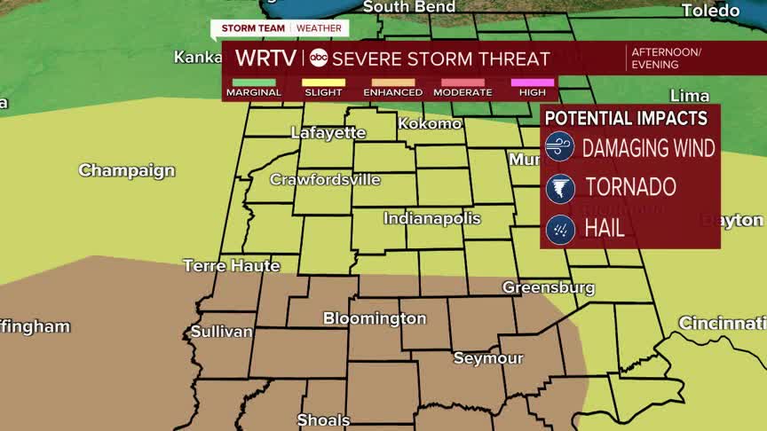Here is a look at the threats by probability. Damaging winds will be the main concern for everyone. Hail is possible - over and inch in diameter. The tornado threat is on the low end, but certainly not zero. Make sure you have a way to get alerts today and check in with the WRTV storm team for updates.