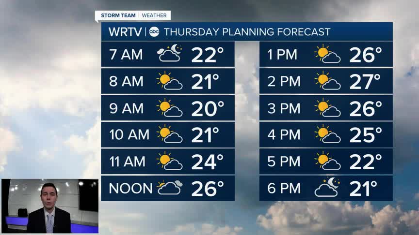 Yet another blast of cold air is settling in across Central Indiana. A NW wind of 5-10 mph will push feels like temperatures into the single digits Thursday morning. Be sure to minimize time outside, and cover up from head to toe when you do venture out. Wind chills stay in the teens through the afternoon.