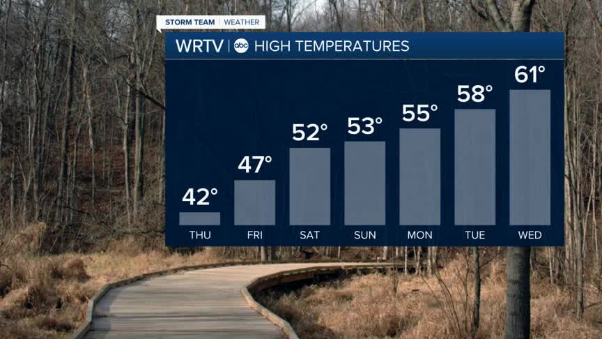 On Friday and through the weekend, temperatures will start to climb. Expect upper 40s with sunshine on Friday, rising into the low 50s on Saturday for Valentine’s Day, and then reaching the mid 50s on Sunday. We’ll be watching a storm to our south Saturday night into Sunday that may try to bring some showers in. The bulk of the rain will stay south, but depending on the exact track, we might have to bring some rain showers into southern Indiana.