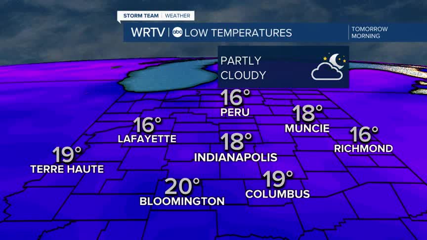 After a frigid start Monday morning, wind out of the southwest pushes warmer air into Central Indiana. High temperatures are still below normal in the mid 20s this afternoon, but it is an improvement from this morning's temperatures below zero. Because of the wind, we'll feel like we are in the teens through the afternoon and evening, so keep your hat and gloves handy.