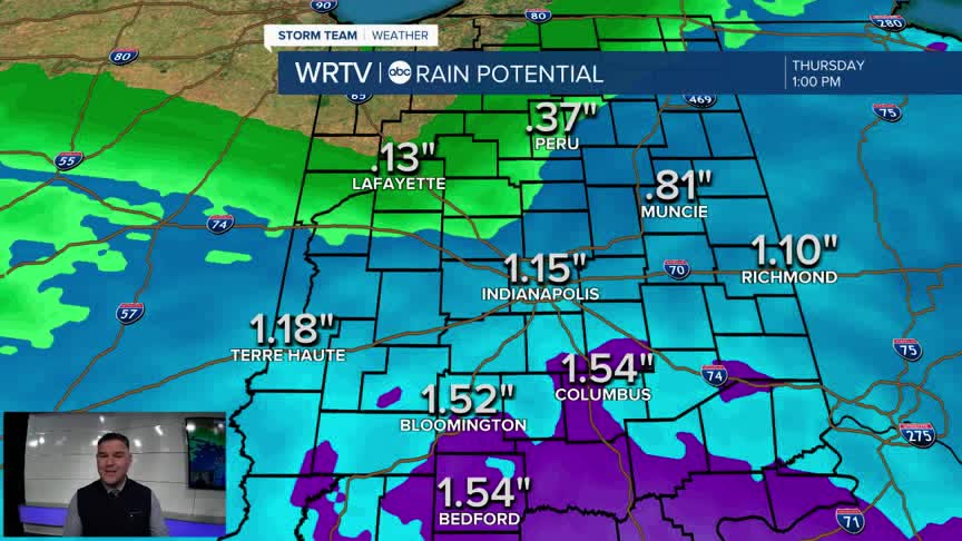 The heaviest rain will be south of I-70, with a sharp cut-off north and west of Indy. It will also be very breezy. Rainfall totals could exceed an inch in southern locations.
