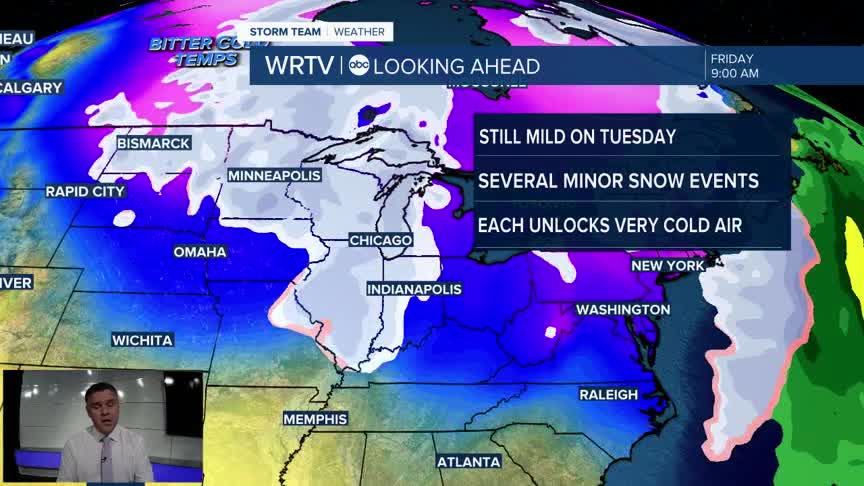 With each push of colder air, there will be a chance of mainly snow showers. Some rain showers could sneak in on Wednesday. All of the snow events appear to be minor, but a fairly strong lake effect snow band is likely in the northern part of the state on Wednesday. We'll have to see how far south some of those snow showers make it.