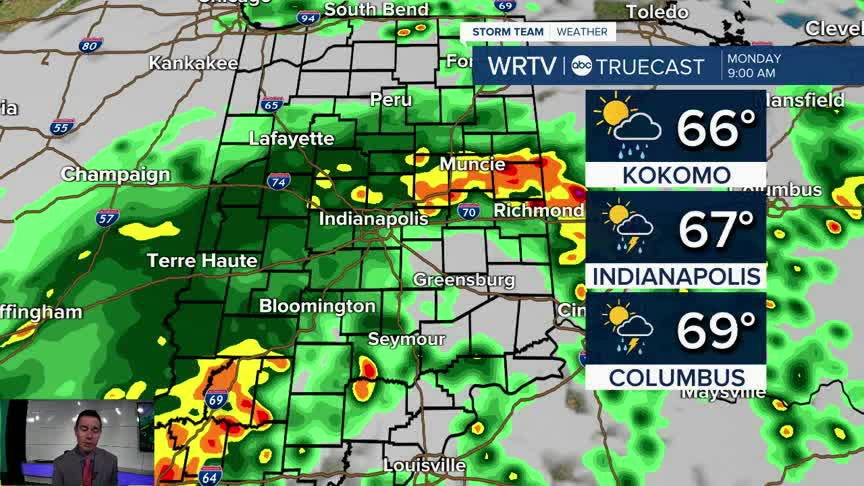 Monday: Mostly cloudy with rain and storms. High: 75°
