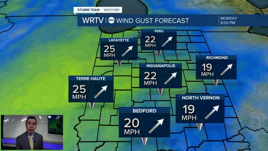 Our weekend has gone through a seasonal shift. After feeling like summer Saturday, it feels much more like fall today. The system brought Indy its greatest rainfall total since the end of July. The rain pushes east this evening, and skies clear pretty quickly tonight. Gusty winds also decrease through the evening. Temperatures turn chilly with lows in the 30s to near 40°.