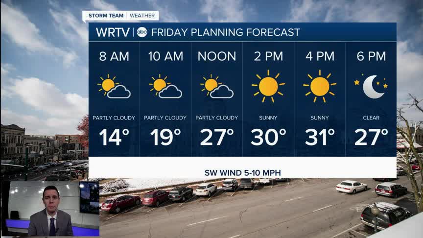 Our Friday starts with frigid temperatures. Northern areas begin the day in the single digits with teens elsewhere. We're forecasting a low of 11° in Indy. That comes close to recording breaking cold. December 5th, 1886 has long held the coldest morning with a low of 8°. Some areas of freezing fog will also be possible. This could lead to some slick spots.