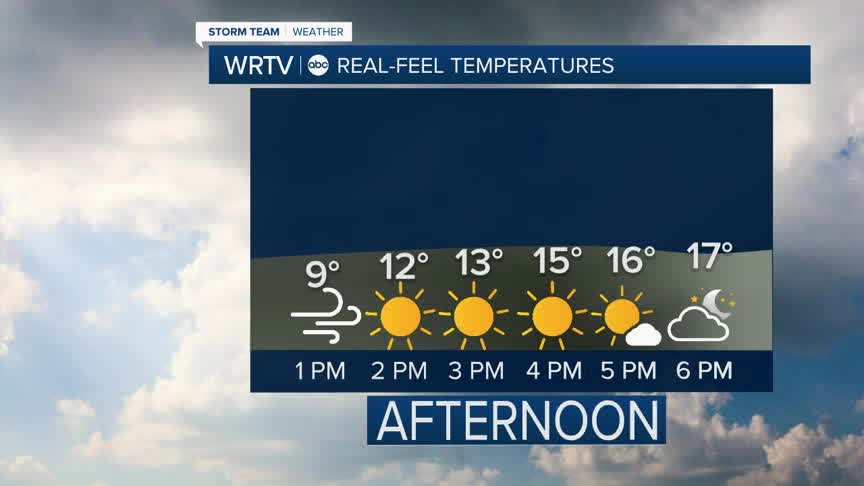 Today: Cold and breezy. Wind chills in the teens. PM clouds clearing. High: 26°