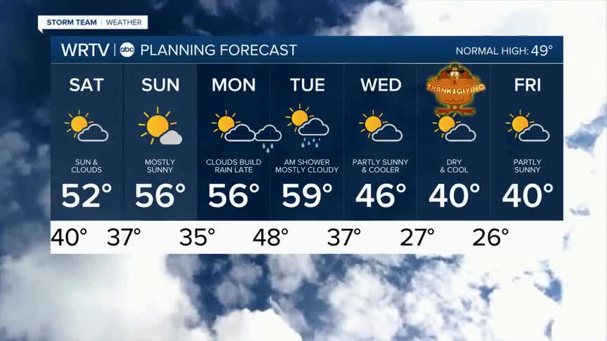 Once we get to the start of next week, rain chances will return for the area. Look for them to arrive Monday evening and continue through Tuesday. After the rain clears, it will turn colder for Thanksgiving, but conditions are expected to remain dry.