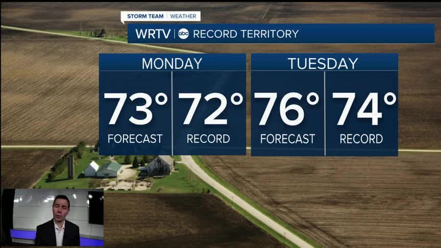 It's another round of nice weather with lots of sunshine Monday. It will be breezy though. Gusts around 35 mph are possible. Unusually warm temperatures make a return during the afternoon. In fact, we could very well set another record. The current record is 72° set way back in 1878. We're forecasting a high of 73° in Indy.