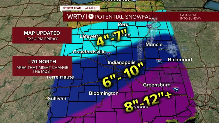 Almost all of central Indiana is now under a Winter Storm Warning through Monday. Even after the snow ends, difficult travel is expected to continue due to very cold temperatures. Road treatments may not be effective, so it could take some time for conditions to improve even after the snow ends Sunday evening. That is why the National Weather Service has extended the warning into Monday.