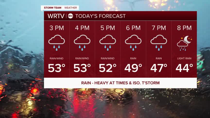 Today: AM showers, PM rain. Wind gusts 40+ mph. High: 53°