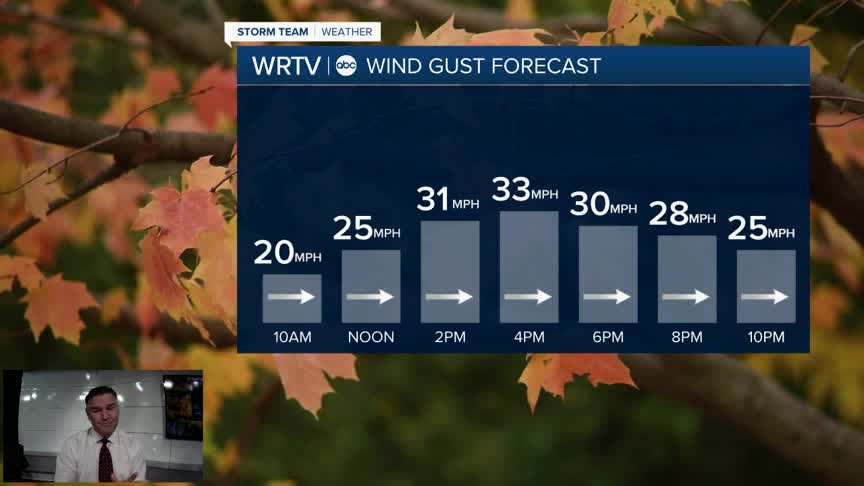 Wind gusts will peak in the mid-30 mph range during the afternoon, then begin to subside once the sun starts to set in the evening.
