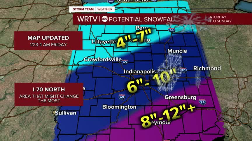 Most of our area looks to land in the 6"-10" range. That will be storm total by midday Sunday. We will start to see snow by Saturday afternoon with most of the snow expected to fall overnight into Sunday morning. We will keep a close on on the forecast heading into the weekend. The area that will most likely need adjustments is north of I-70. When snow fills mixes with air this cold it can sometimes evaporate and cut into totals.